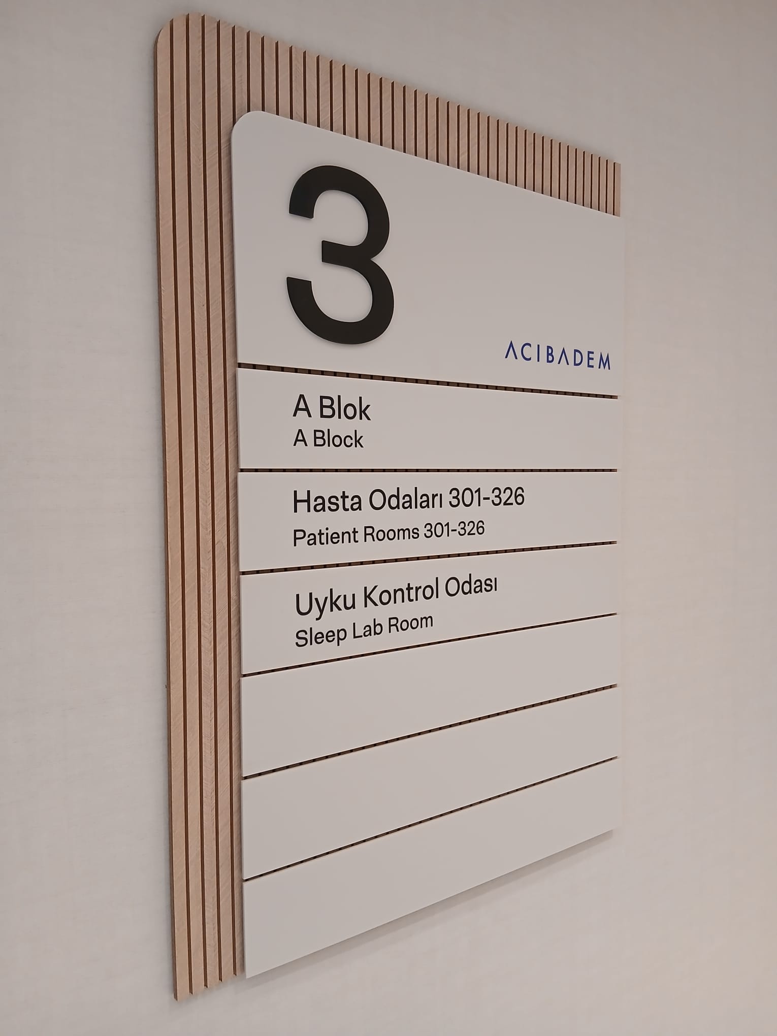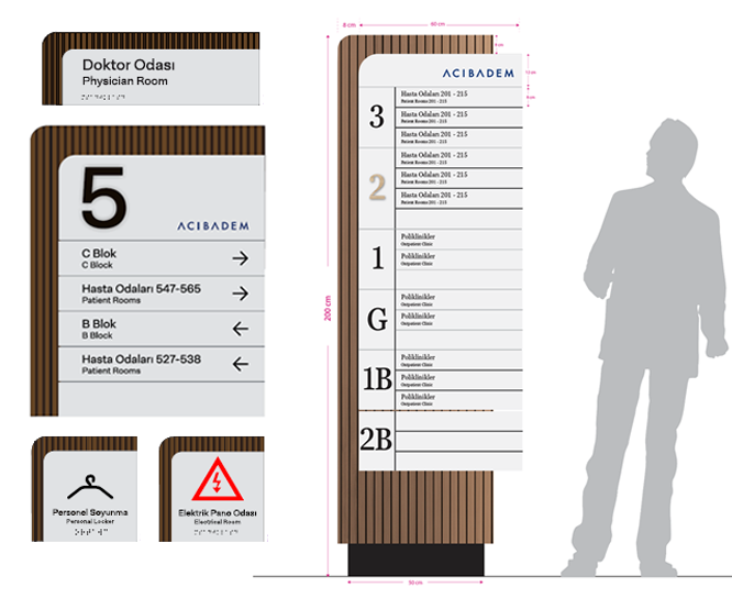 Kurumsal kimlik ile tam uyumlu olarak ele alınan yönlendirme ürünleri; estetik, okunabilirlik, fonksiyonellik ve uzun ömürlü kullanım kriterleri doğrultusunda uygulanmıştır. İç ve dış mekân bütünlüğü gözetilerek oluşturulan yönlendirme dili, Acıbadem İzmir Kent Hastanesi’nin modern mimari karakterini destekleyen, net ve kullanıcı dostu bir deneyim sunmaktadır.
